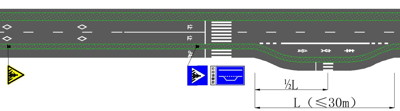 臨近公交站臺(tái)上游的恰當(dāng)位置,提前設(shè)置“港灣式公交站臺(tái)”指示標(biāo)志和“人行橫道”指示標(biāo)志,根據(jù)需要,可設(shè)置“注意行人”警告標(biāo)志,采用單立柱或附著式安裝方式。非機(jī)動(dòng)車道臨近站臺(tái)處施劃“注意前方路面狀況”地面標(biāo)記。