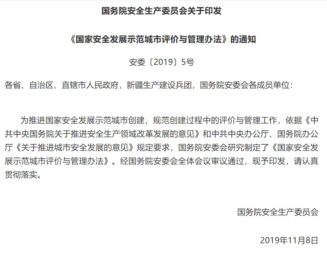 為推進(jìn)國家安全發(fā)展示范城市創(chuàng)建,規(guī)范創(chuàng)建過程中的評價與管理工作,11月8日,國務(wù)院安全生產(chǎn)委員會,向各省、自治區(qū)、直轄市人民政府,新疆生產(chǎn)建設(shè)兵團(tuán),國務(wù)院安委會各成員單位印發(fā)了《國家安全發(fā)展示范城市評價與管理辦法》(以下簡稱“評價辦法”)的通知。