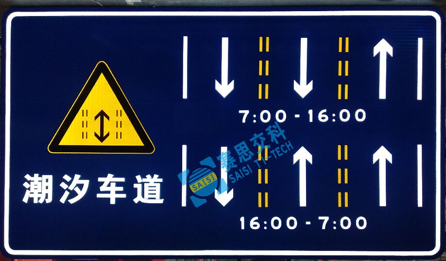 本款潮汐車道發(fā)光標(biāo)志牌,采用半透式主動發(fā)光工藝,標(biāo)志整體采用指示類標(biāo)志版面,依據(jù)國標(biāo)《道路交通標(biāo)志和標(biāo)線》(GB5768-2009)中所列的《潮汐車道標(biāo)志》警告類版面,并對中間車道在不同時(shí)間段內(nèi)的通行權(quán)進(jìn)行分配,實(shí)現(xiàn)潮汐車道交通秩序的管控。地面應(yīng)當(dāng)配合國標(biāo),施劃潮汐車道地面標(biāo)識。