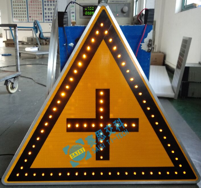 警告類交通標志牌,其主要功能為提前警告車輛和行人,注意前方危險源、或可能的危險因素,提醒司機謹慎駕駛。如:“注意兒童標志”、“注意前方合流標志”、“注意行人標志”、“注意橫風標志”、“注意村莊標志”、“事故易發路段標志”等,其形狀通常是三角形;其顏色為黃色、黑色和黑色的指示牌。該類標志,通常選用“全透面板型主動發光標志”、“外置點陣型主動發光標志”等類型。