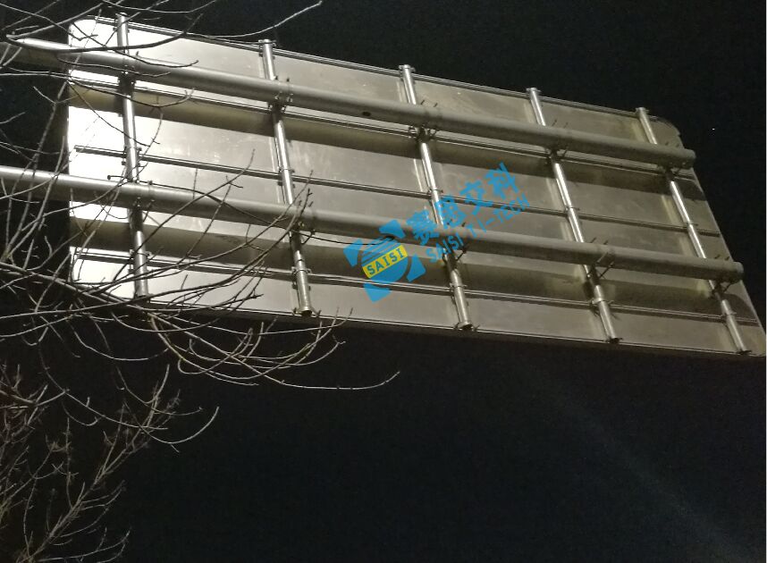 半透發(fā)光標志整體重量,較普通標志重,通常約25KG/平米,如果僅采用傳統(tǒng)標志的滑槽固定結構,標志的整體重量僅靠背板與抱邊連接處承擔重力,會導致標志后背板出現(xiàn)凸型拉伸面,長久下去,若遇上大風的橫向風壓,極易發(fā)送結構脫落的危險隱患。我們通常采用外接鍍鋅管轉移受力結構,將鍍鋅管的一段連接在標志的整體承重框架中,一段安裝抱箍、卡箍連接懸臂桿,保證的安裝結構的整體受力穩(wěn)固,能抵御較大的自身重力和橫向風壓。