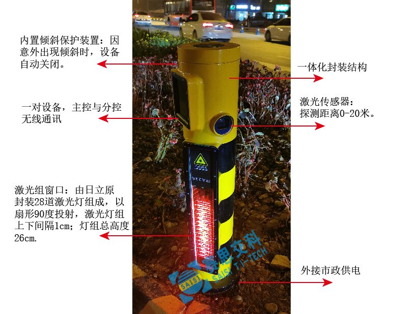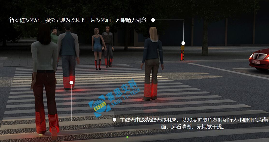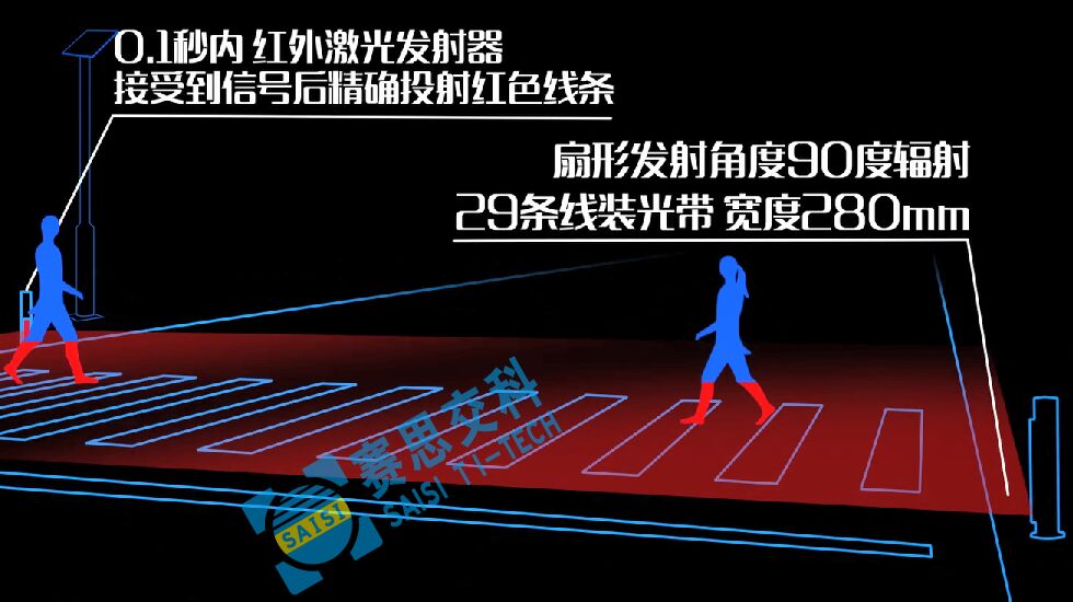 當(dāng)行人即將進入斑馬線將要過街的瞬間,本裝置快速、準(zhǔn)確檢測到有行人過街,立刻投射28條紅色激光線到過街行人小腿處,形成明顯的紅色區(qū)域投影警示,機動車駕駛員可以在照明不足、注意力不集中或視線受影響情況下(對面車輛遠光、雨霧天氣等),遠距離得到紅色警示和發(fā)現(xiàn)行人動態(tài),并及時做出反應(yīng),從而減少交通意外的發(fā)生。