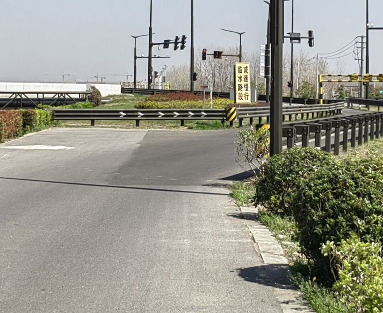 這條沿河路就是原來的長河河堤,政府為民謀福祉,投入不少資金鋪裝了瀝青,道路品質較以往提升了檔次。道路全線路寬約為7米,一邊是臨近長河,一邊是低洼深坎的村莊和池塘,車輛仿佛在“懸崖峭壁”上行走。在道路初期施工的“三同時”階段,雖設置了一些必要的交通安全設施,但有些已經明顯功能失效了(如:標志膜面老化;地面標線磨平等),還有不少應設未設的缺失,讓道路交通安全隱患徹底浮出了水面。如下圖所示,右側是坡度陡、落差大的苗圃林。