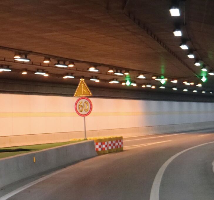 5、建議在進入隧道入口通道及前方地面設置彩色熱熔預成型落地限速標志,落地標志上采用圖案和文字提示不同種類的車輛行駛方向,顏色均采用標準的交通色。彩色熱熔預成型落地標志與交通標志形成立體的交通指引模式。