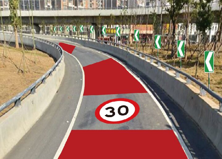 在道路彎道處,設(shè)置輪廓標(biāo)、彎道誘導(dǎo)標(biāo)志、道口標(biāo)、發(fā)光警示柱、彩色防滑路面鋪裝和限速標(biāo)志標(biāo)線等。根據(jù)彎道的分類和彎道的實際情況,選擇相應(yīng)的交通安全設(shè)施,以保障道路彎道處行車安全,降低交通事故發(fā)生率,保障路網(wǎng)通行暢通,提升城市形象。具體的設(shè)置情況如右圖所示: